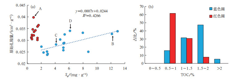从抽提量来看,各岩相极性烃和弱极性烃比例相近,通过氮气吸附对原始样品、正己烷抽提后样品和二氯甲烷与甲醇(9∶1)混合溶液抽提后样品进行三次测定,可以发现3类岩相孔隙中的烃类聚集差异显著(图 7)。原始样品存在2~128nm孔径的孔隙空间,目前无法直接测定这一部分孔隙空间是由易挥发烃占据还是无烃类占据。在原始孔隙体积与密闭热释测定的易挥发烃(S0)关系中(保压样品在还未发生易挥发烃散失情况下进行密闭破碎并测定90℃条件下释放的易挥发烃类含量),当TOC大于1%时,原始孔隙体积与S0具有较好的正相关性,表明原始孔隙体积中本身含有较多的易挥发烃,当TOC小于1%时,易挥发烃含量极低,与原始孔隙体积几乎无相关性,因此TOC小于1%时,样品原始孔隙中几乎无烃类(图 8)。图 8a中A标注的钙质页岩(TOC仅为0.91%),虽然原始孔隙量达到0.035cm3/g,但易挥发烃量仅为0.902mg/g,表明原始孔隙内几乎无烃类。B标注的高TOC层状黏土(质)页岩(TOC达3.65%),虽然原始孔隙量为0.033cm3/g,但易挥发烃量达到12.14mg/g,表明原始孔隙主要被易挥发烃占据。C标注的低TOC纹层状长英质页岩(TOC仅为0.68%),虽然原始孔隙量仅为0.028cm3/g,但易挥发烃量达到4.13mg/g,表明原始孔隙中主要被易挥发烃占据。D标注的中—高TOC纹层状混合质页岩(TOC为1.46%),虽然原始孔隙量为0.034cm3/g,但易挥发烃量达到6.12mg/g,表明原始孔隙主要被易挥发烃占据。