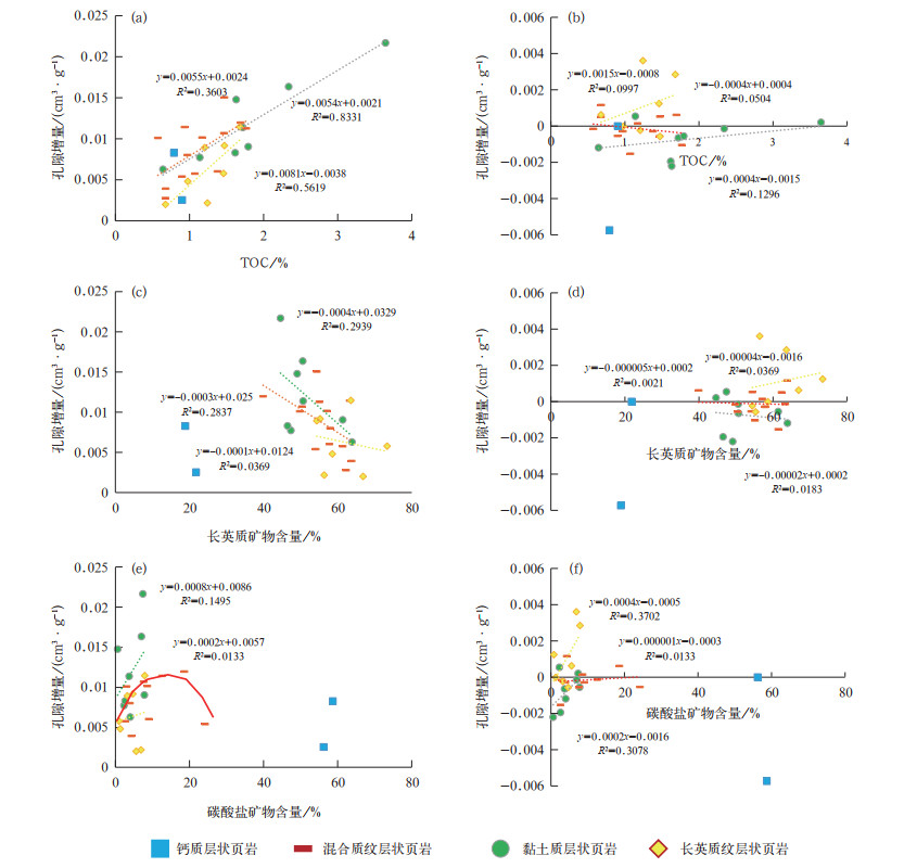 弱极性烃占据孔隙空间随长英质矿物含量增加而减少(图 9c),低TOC纹层状长英质页岩整体含油性差,以弱极性烃为主,主要分布于直径大于64nm的孔隙中,少量赋存在小于8nm的孔隙中。此现象主要由两方面原因造成,一是长英质纹层一般呈正粒序或反—正复合粒序,具侵蚀底面或层间侵蚀面,常见生物扰动和泄水构造,表明其发育在水体较深、气候湿润、水体动荡的环境中,为半深湖—深湖陆源注入的低密度浊流沉积,沉积时带来大量氧气,将深水区的还原—强还原环境短暂改造为还原—弱还原甚至弱氧化环境,氧化破坏湖盆底部有机质,进而造成TOC降低,生烃能力下降,低TOC纹层状长英质页岩的黏土质纹层中重烃含量显著小于其他岩相就是由此造成;二是长英质纹层厚度增大,胶结作用增强,大量原生孔隙被方解石充填,抑制烃类充注,只有特别轻的烃类才能充注,造成低TOC纹层状长英质页岩的长英质纹层中以轻烃为主。极性烃被抽提后的孔隙变化与长英质矿物无相关关系,表明长英质对极性烃类的分布没有控制作用(图 9d),主要是由于极性烃类大多富集在黏土质纹层中,而黏土质纹层中的石英存在自生石英和陆源碎屑石英两种,其中自生石英主要来自黏土矿物转化过程中形成的自生硅质[43],当自生石英发育时,极性烃占据的孔隙空间与石英呈正相关关系,当陆源碎屑石英发育时,极性烃占据的孔隙空间与石英呈负相关关系。