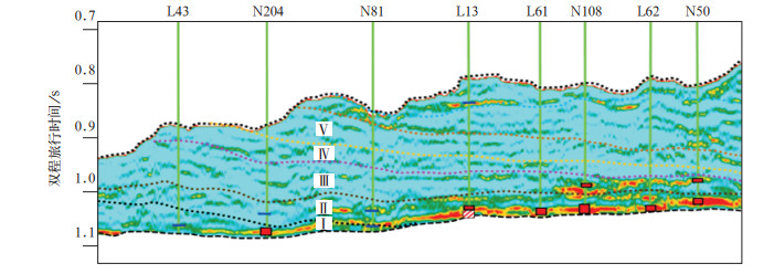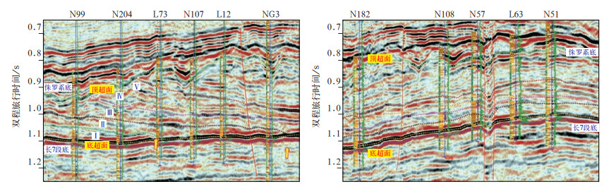3.1 前积层顶底、界面的确定区域上延长组长7段底部发育一套稳定分布的张家滩油页岩,油页岩底界在地震剖面上表现为一套强波峰反射特征,横向连续性好,钻井地质分层与地震层序对应性好,全区对比稳定(图 5)。界面之上由湖盆斜坡向中心推进时,在湖盆底自南西向北东下倾方向终止,油页岩稳定界面可作为地震层序的底界面;印支运动末期上三叠统延长组遭受不同程度的剥蚀形成起伏不平的古地貌,在此基础上沉积了侏罗系富县组或延安组,与延长组形成了区域角度不整合接触,界面之上由于抬升剥蚀及河道下切引起的地层起伏不平及其内部显示超覆充填特征,该区域性不整合面可作为层序界面的顶界面。