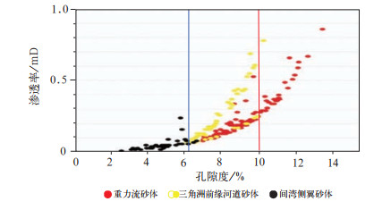 延长组长7段储层物性致密,从宁县—正宁地区240口探井物性统计结果看(图 11),三角洲前缘河道砂孔隙度为6%~10%,重力流砂体孔隙度为9%~12%。同一套储层内部,油气主要集中在相对高孔、高渗的优质储层空间内,如第Ⅱ期L13井长7段下部1274.8~1288.5m段砂体虽具紧靠油页岩的优势,但由于储层物性差(平均孔隙度为7.73%,渗透率为0.06mD),导致含油性差;而上部1239~1261m平均孔隙度为11.1%,渗透率为0.31mD,物性条件相对较好,砂体横向连通好,整体含油性高。