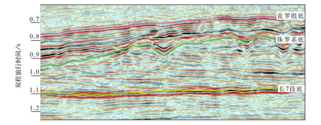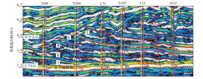 根据地震剖面追踪的结果,每个沉积单元不同相序的地震响应特征不同。Zeng Hongliu等认为将原始地震剖面转换为90°相位化剖面后,使得振幅剖面特征与地层岩层具有良好的对应关系[33-35]。从宁县—正宁地区90°相位化振幅剖面看(图 7),长7段底部稳定油页岩在振幅剖面上为白色,自然伽马曲线为高值特征;暖色调代表砂岩发育区,自然伽马曲线表现为低值特征,冷色调代表大套泥岩发育区,自然伽马曲线表现为高值特征。
