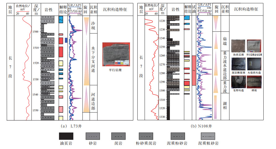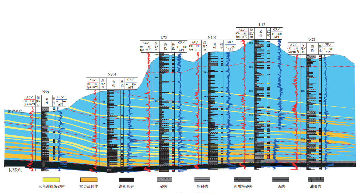 不同的沉积旋回结构表现为不同的测井响应特征,前积层上段(长3段)、中段(长4段+长5段)、下段(长6段+长7段)由于岩性组合变化其测井响应差异明显。前积层上段遭受强烈剥蚀后残存地层(长3段)主要表现为三角洲前缘亚相沉积,主要发育水下分支河道和间湾沉积,电位曲线呈齿状箱形或近似钟形;前积层中段(长4段+长5段)斜坡带主要为泥岩沉积,自然伽马及自然电位曲线值整体偏低;前积层下段(长7段至长6段)半深湖—深湖区则为富含砂体区,为重力流砂体快速堆积,重力流砂体与湖相泥岩互层出现,砂体累计厚度大,自然电位曲线表现为明显的箱形或齿化箱形特征。
