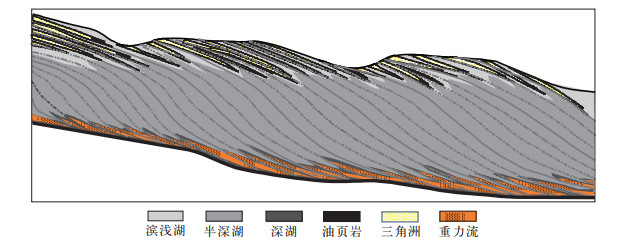 3.3 沉积演化特征受印支运动影响,鄂尔多斯盆地西南缘发生强烈隆升,古地形为重力流的发育提供了地形条件,由于“西南陡东北缓”的湖盆底型造成不同地区、不同形状、不同方向、不同规模前积反射结构。通过对沉积单元不同位置的岩心观察、测井相与地震相分析,每个沉积单元内部相序具有三段式沉积结构,即“上段三角洲前缘(富砂)—中段斜坡带(富泥)—下段重力流(富砂)”。基于地震层序格架研究改变了传统等厚“千层饼式”地层分布模式,不同前积层砂体具备纵向上为不同微相叠加、横向上连片分布的特征(图 8)。这是由于长7段至长3段沉积期,湖盆边缘一侧发育辫状河三角洲砂体,随着三角洲砂体的发育壮大,发育大规模进积型三角洲,在盆地斜坡带砂体堆积厚度增大,由于风暴等因素诱发下前缘砂体发生滑塌,在盆地坡脚处前缘砂体与湖水混合而形成重力流,重力流携带碎屑物质向深水区搬运而形成浊积扇。明确了湖盆区前积层的充填序列、演化过程及沉积模式,有效解释了长期以来砂体分布于长7段叠置连片分布的原因。
