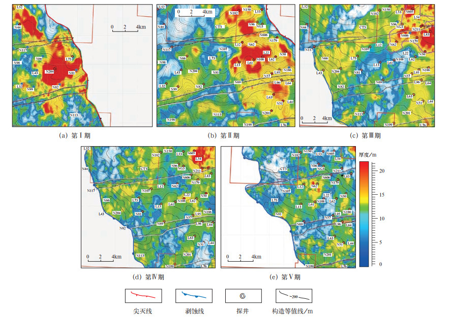 基于井模型和地震数据融合反演得到高分辨率的反演数据体[36]。利用研究区叠前反演得到的4个弹性参数(纵波速度、密度、杨氏模量和泊松比),通过交会分析认为含油砂岩表现为低泊松比特征。从提取的各期砂体分布平面图中(图 9),得出以下几点认识:(1)相对完整相序的前积层,下段如第Ⅰ、Ⅱ期前积层砂体上超并尖灭于湖盆底部,尖灭线呈北西向展布,与湖岸线方向一致,上段第Ⅲ、Ⅳ、Ⅴ期抬升遭受剥蚀;(2)每期前积沉积单元可进一步划分为上段三角洲前缘沉积(大部分地层遭受剥蚀),中段斜坡带为过渡带,泥岩集中发育,下段为重力流沉积,上段河道砂体呈北东向条带状展布,重力流砂体整体沿湖岸线分布;(3)每期前积层砂体展布均具有明显的分区分带特征。前积层上段发育水下分支河道砂体;前积层下段砂体位于深水坡折带附近,为不规则坨状、条带状或朵状。