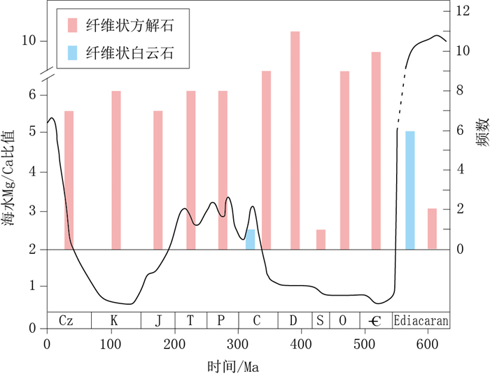 图 1 埃迪卡拉纪—显生宙纤维状白云石和方解石丰度统计图 Fig. 1 Abundance distribution of the Ediacaran–Phanerozoic fibrous dolomite and calcite 频数代表公开报道的频数/频率,其具体剖面/区域参考表 1。黑色曲线为海水Mg/Ca比值,埃迪卡拉纪与显生宙数据修改自文献[3, 5] |