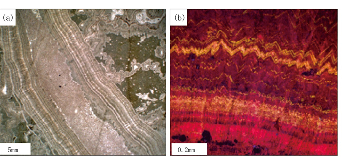 图 2 澳大利亚成冰系礁相纤维状白云石单偏光(a)和阴极发光照片(b)[106] Fig. 2 Single polarization (a) and cathodoluminescence (b) photos of fibrous dolomite in Cryogenian reef complexes [106] |
