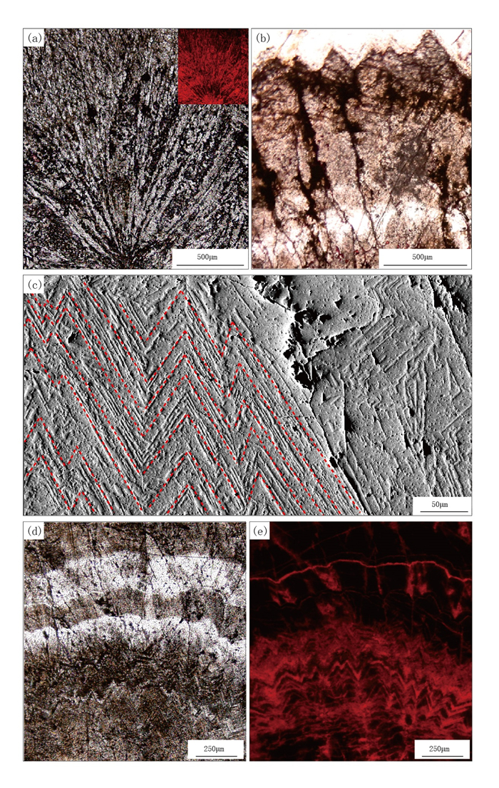 保存良好的生长环带是判别原生成因纤维状白云石的重要岩石学特征之一。该类环带在阴极发光观察下通常呈现出清晰的周期性生长结构(图 2),在扫描电镜下也可观察到结构连续、界限明确的环带状晶体生长纹理[10]。相比之下,次生成因的纤维状白云石在形成过程中通常经历了不同程度的重结晶或白云石化改造作用,难以保存清晰的环带特征,表现为斑杂状亮红色或亮红色阴极发光,甚至部分晶体顶部呈亮红色[3, 13, 105-106]。