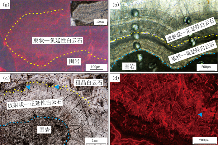 纤维状白云石的结构形态也是区分成因类型的重要依据。次生成因的纤维状白云石因在一定程度上继承了文石母质或高镁方解石母质的特征,而常常展现出针状或葡萄状结构[107]。此外,具有方形终端结构的白云石晶体往往指示其为交代文石后的产物[88]。这些结构特征与原生白云石有所差异,后者通常具有更加规则、有序的纤维状结构。晶体光学特征是区分纤维状白云石成因类型的重要依据。原生成因纤维状白云石通常具有正延性光学特征,即其晶体C轴与主要生长方向的夹角较大;而交代成因的纤维状白云石则常表现为负延性光学性质,即其晶体C轴与主要生长方向之间的角度较小[3, 91, 95, 106]。