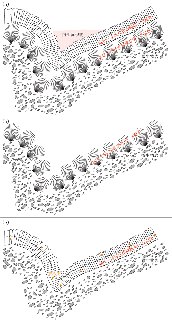 图 6 微生物礁相纤维状白云石胶结物充填过程示意图 Fig. 6 Schematic filling process of fibrous dolomite cement of biological reef facies (a)四川盆地灯影组;(b)九龙湾剖面陡山沱组盖帽碳酸盐岩;(c)四川盆地灯影组,塔里木盆地奇格布拉克组 |