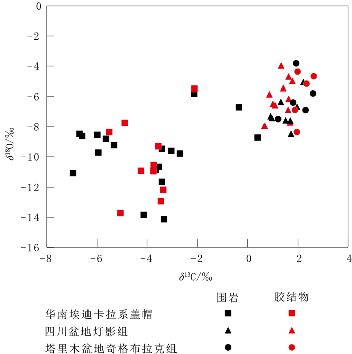 图 7 中国埃迪卡拉系白云岩围岩与纤维状白云石碳氧同位素交会图(数据来自文献[10-11, 13, 89, 94, 152]) Fig. 7 Cross plot of carbon and oxygen isotopes between dolomite host rock and fibrous dolomite in the Ediacaran in China (data from references [10-11, 13, 89, 94, 152]) |