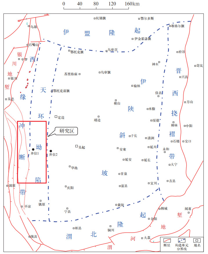 图 1 鄂尔多斯盆地西缘中段构造位置图 Fig. 1 Structural location of the middle section of the western margin of Ordos Basin |