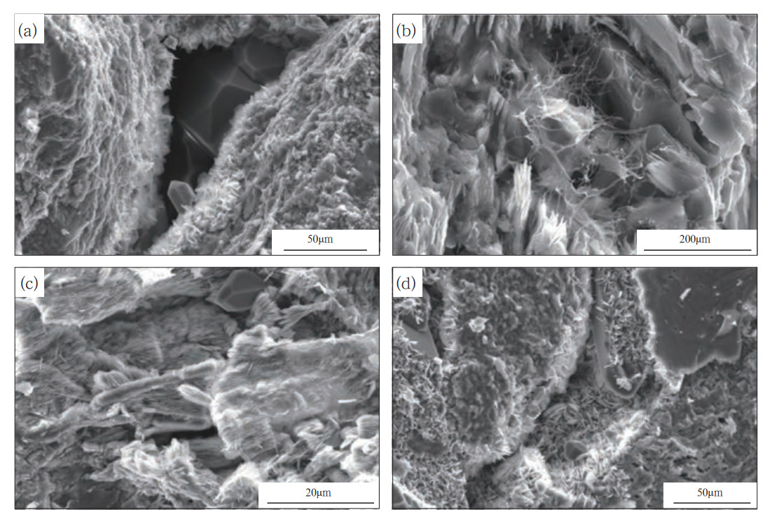 图 10 研究区长8低阻油层扫描电镜照片 Fig. 10 SEM image of low-resistivity oil layer in the eighth member of Yanchang Formation in the study area (a) H208井,2803.6m,石英及高岭石胶结充填部分残余粒间孔喉中;(b) H201井,2752.4m,长石可见溶蚀产生粒内孔;(c)D-5井,2652.4m,伊利石黏土矿物充填孔隙中;(d) D-42井,2852.2m,颗粒具定向性,绿泥石薄膜沿颗粒边缘发育,局部少量铁方解石呈星散状分布,连晶状充填孔隙 |