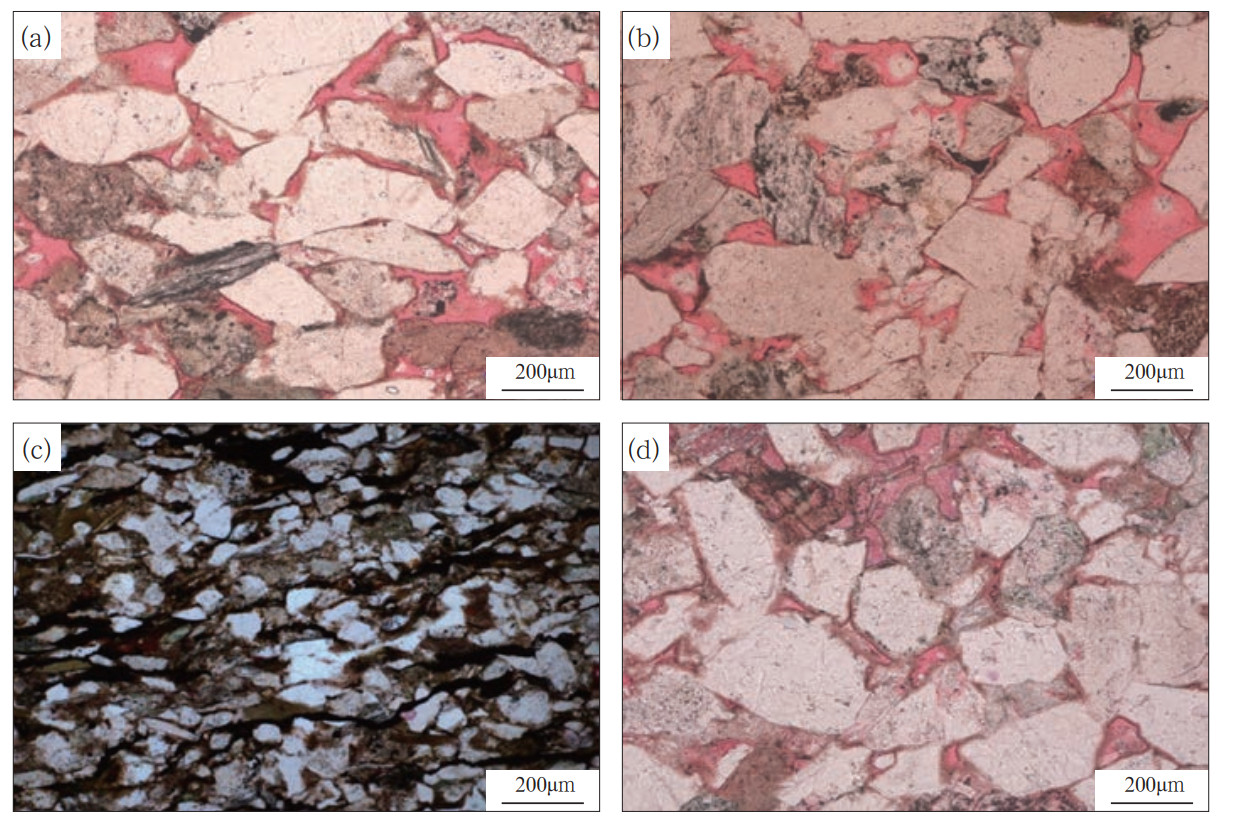图 11 研究区长8低阻油层铸体薄片照片 Fig. 11 Thin section photos of low-resistivity oil layer in the eighth member of Yanchang Formation in the study area (a) YQ-030井,2811.6m, 黑云母水化、泥化,少量铁方解石呈斑状分布,连晶状充填孔隙并交代颗粒,石英次生加大;(b)YQ-029井,2844.7m,颗粒具定向性,绿泥石薄膜沿颗粒边缘发育,局部少量铁方解石呈星散状分布,连晶状充填孔隙;(c) D-38井,2651.8m,少量方解石局部连晶状充填孔隙,绿泥石薄膜沿颗粒边缘发育,3~5μm,石英次生加大;(d) D-1井,2799.9m铁方解石呈斑状分布,连晶状充填大部分粒间孔隙并交代颗粒,绿泥石薄膜呈孔隙衬里状发育,厚8~10μm |