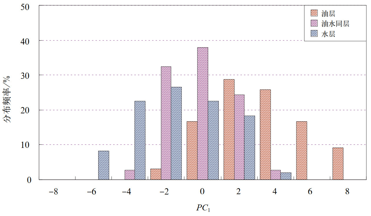图 14 主成分分布频率与流体类型对应关系图 Fig. 14 Corresponding relationship between principal component distribution frequency and fluid type |