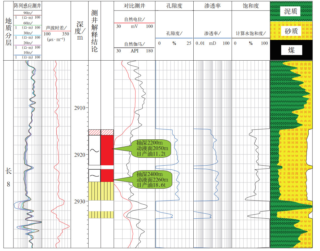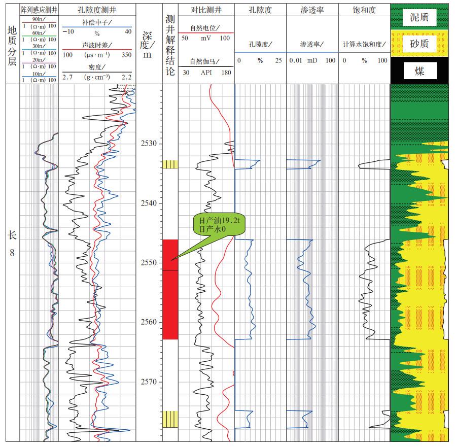 图 3 盆地本部典型井2长82测井解释成果图(井2位置见图 1) Fig. 3 Logging interpretation results of the second sub-member of the eighth member of Yanchang Formation in typical Well 2 in the basin (well location is in Fig. 1) |