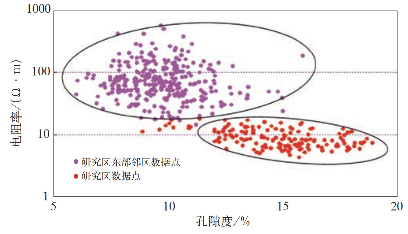 图 4 研究区长8储层孔隙度与电阻率交会图 Fig. 4 Cross plot between porosity and resistivity of reservoir in the eighth member of Yanchang Formation in the study area |