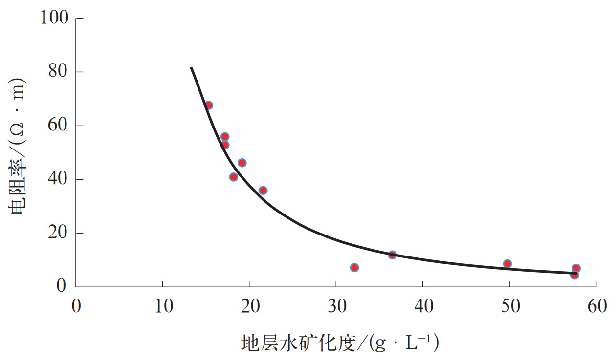 3.1 高地层水矿化度当地层水矿化度变化大时,油层中的高地层水矿化度会形成发达的导电网络,使得油层电阻率降低,将较大的影响储层电阻率,使得油层与水层的界限不易识别。研究区地层水水型主要为CaCl2型,Cl-浓度介于22~35g/L,平均浓度为28.5g/L;总矿物质浓度介于32~58g/L,平均浓度为46.7g/L。而与研究区相邻的东部区域,Cl-浓度介于4~18g/L,平均浓度为10.5g/L;总矿物质浓度介于15~22g/L,平均浓度18.1g/L。分别绘制地层水Cl-浓度与电阻率曲线图和地层水总矿化度浓度与电阻率曲线图(图 5、图 6),随着地层水Cl-浓度和总矿化度浓度增加,油层电阻率下降,且低阻段变化斜率明显大于高阻段,说明研究区高地层水矿化度是低阻油层形成的主要因素之一。