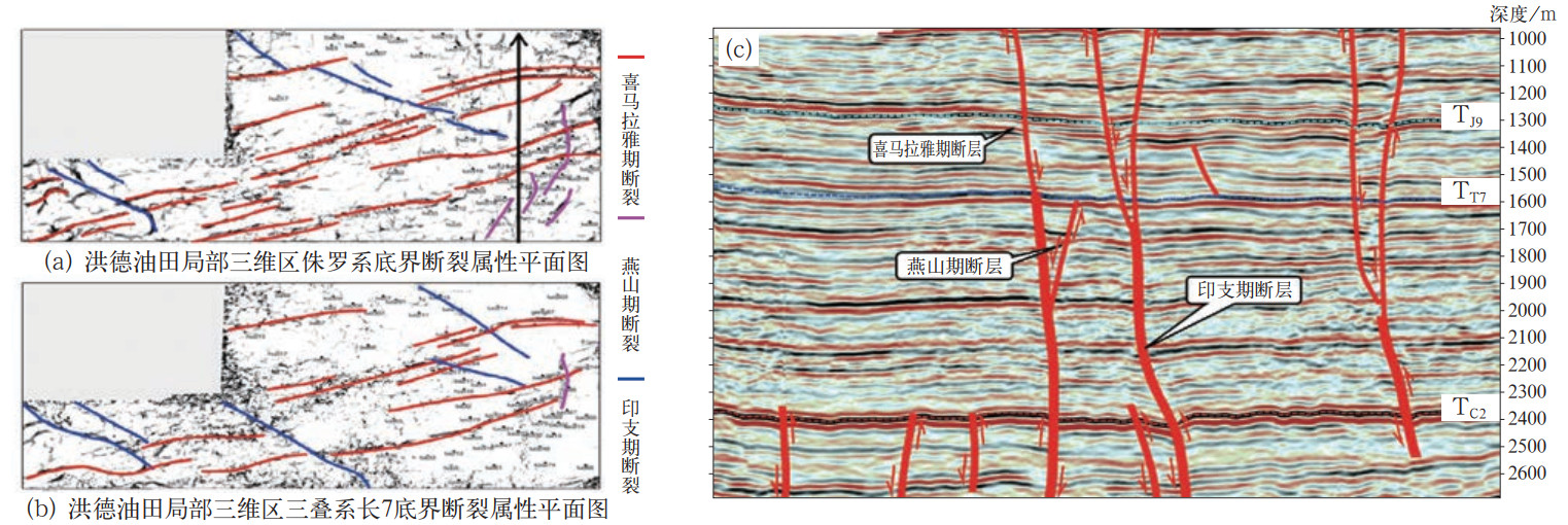图 7 研究区断裂属性平面图(a、b)及三维典型连井地震剖面(c) Fig. 7 Plane distribution of fault attributes (a、b) and 3D typical well connected seismic profile (c) in the study area |