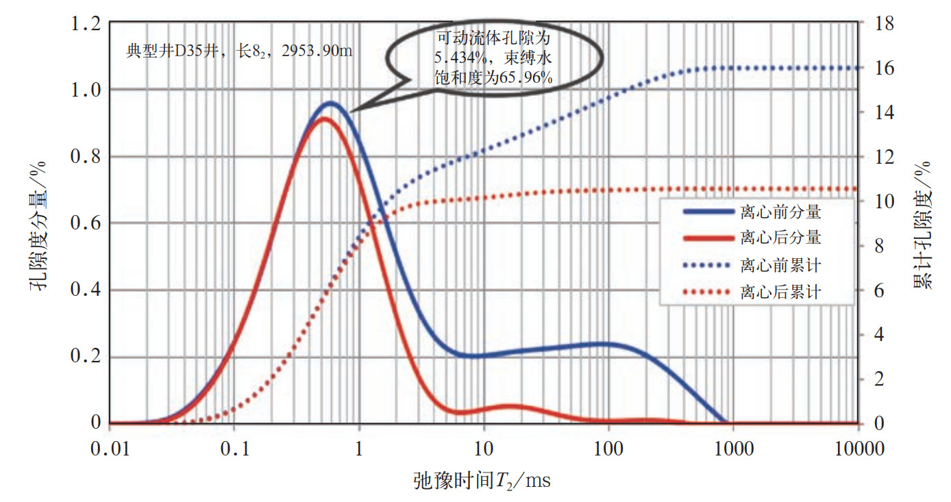 图 9 核磁共振流体可动性分析化验T2分布图 Fig. 9 NMR T2 spectrum of fluid mobility analysis |