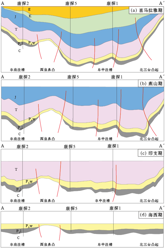 凹陷构造演化分析表明,阜东斜坡西泉鼻凸形成于石炭纪,在中二叠世期间持续隆升,将阜中洼槽与阜南洼槽分隔。中二叠世,凹陷内芦草沟组一段(芦一段)发育扇三角洲沉积,芦草沟组二段(芦二段)与芦草沟组三段(芦三段)则以湖相沉积为主;晚二叠世早期,上乌尔禾组一段(乌一段)和上乌尔禾组二段(乌二段)广泛沉积,以厚层砂砾岩为主,实现了地形的“填平补齐”;晚二叠世晚期西泉鼻凸表现为水下低凸起,上乌尔禾组三段(乌三段)呈广覆式湖相沉积。进入三叠纪,西泉鼻凸继承性发育,仍为水下低凸起,阜中洼槽处于深湖—半深湖沉积环境;东部沙奇凸起发生剧烈抬升,导致三叠系顶部遭受强烈剥蚀。早侏罗世,阜47鼻凸和康探1鼻凸开始低幅度隆升。至白垩纪,区域整体抬升,侏罗系遭受剥蚀,凸起区剥蚀程度尤为显著,此时阜东斜坡“两凹夹一凸”的构造格局已基本定型(图 2)。