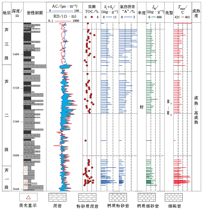 图 3 阜康凹陷东部阜49井芦草沟组地球化学剖面 Fig. 3 Geochemical section of Lucaogou Formation in Well Fu 49 in the eastern Fukang Sag |