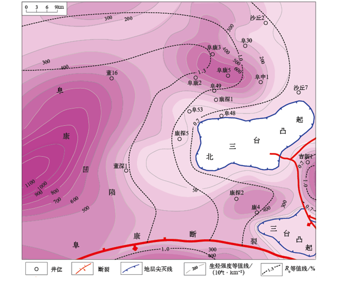 芦草沟组烃源岩的成熟度与生烃强度在凹陷内不同构造单元中具有显著差异。探井资料表明,从凸起区向洼槽区,烃源岩的成熟度与生烃强度均呈现逐渐增高的趋势(图 4)。在阜东斜坡区,康探1井、阜康5井等多口探井揭示发育厚层灰黑色泥岩,岩性细腻、有机质丰富。与凸起区已钻井相比,其有机质丰度、热演化程度及生烃潜力也显著更优,为斜坡区油气成藏提供了重要的物质基础。该区烃源岩的Ro值介于0.7%~1.3%,整体处于成熟—高成熟演化阶段,有利于大量液态烃与裂解气的生成。结合该区较高的生烃强度(图 4),认为其具备形成生烃超压的有利条件,从而为油气的高效输导与聚集奠定了良好基础[16]。