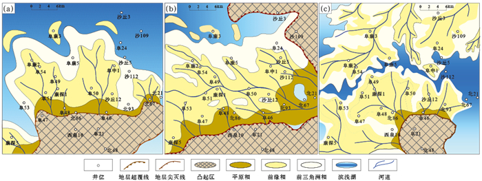 图 5 阜康凹陷东部阜东斜坡芦草沟组一段(a)、上乌尔禾组一段(b)和韭菜园组一段(c)沉积相图 Fig. 5 Sedimentary facies of the first member of Lucaogou Formation (a), first member of Upper Wuerhe Formation (b), and the first member of Jiucaiyuan Formation (c) in Fudong Slope, eastern Fukang Sag |