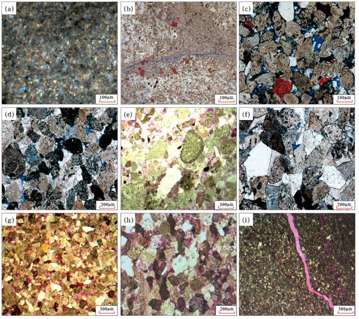 图 6 阜康凹陷东部阜东斜坡芦草沟组、上乌尔禾组和韭菜园组储层铸体薄片 Fig. 6 Casting thin section photos of reservoir in Lucaogou Formation, Upper Wuerhe Formation and Jiucaiyuan Formation on Fudong Slope, eastern Fukang Sag (a) 阜50井,P2l,4451.87m,粉砂质泥岩;(b) 康探2井,P2l,粉砂质泥岩,构造缝;(c) 阜49井,P2l,5300.52m,粒内溶孔;(d) 康探1井,P3w,5013.0m,粒间孔、粒内溶孔;(e)阜4901井,P3w,4960.1m,粒间孔、粒内溶孔;(f) 阜中1井,P3w,3044.1m,粒间孔、粒内溶孔;(g) 阜193井,T1j,2848.1m,粒间孔、粒内溶孔;(h) 康探1井,T1j,4788.5m,粒间孔;(i) 阜康2井,P3w,5575.3m,构造—溶蚀缝 |