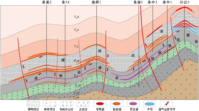 2015年以来,随着高精度三维地震资料的广泛应用,阜康凹陷东部具备形成多类型油气藏大油气区的成藏基础与富集条件正逐步显现。勘探思路也逐步由构造高部位常规油气藏转变为近源—进源探索致密油气藏。2019年,位于阜东斜坡带的康探1井在二叠系芦草沟组砂砾岩试获日产油18m3,实现源内致密油勘探突破;在二叠系上乌尔禾组砂砾岩中试获日产油158m3、天然气11190m3,展现出源内致密油与近源致密油气藏共存的特征;同时在三叠系韭菜园组砂岩中试获日产油102m3,初步刻画出“源内—源上近源—源上远源”多类型油气立体分布的复式格局[6]。在复式油气系统理论指导下,2020年部署的阜47井、阜48井、阜49井及康探5井等4口探井在上乌尔禾组试油获工业油流,进一步证实了上乌尔禾组具备亿吨级勘探潜力。2023年,阜54井在韭菜园组复试获工业油流;近期阜康2井在同一层系再获日产油56m3、天然气8045m3的高产油气流,进一步拓展了三叠系致密油气勘探新领域。同期,中国石化在凹陷区部署的董16井于上乌尔禾组致密砂砾岩中获低产油流,进一步揭示出全凹陷多单元含油的广阔前景。