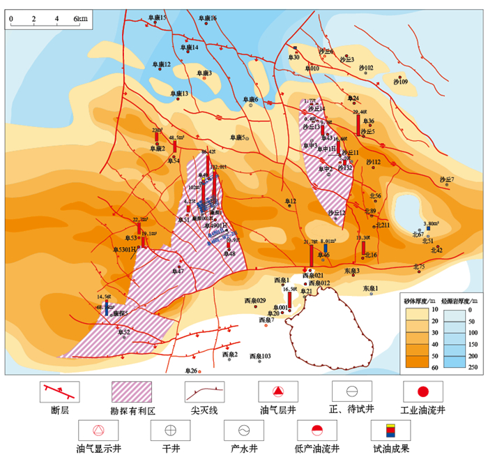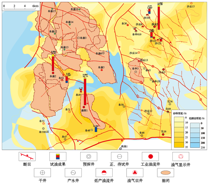 阜康凹陷韭菜园组作为重要的战略接替层系,具备形成规模性岩性油气藏的优越地质条件与可观的勘探潜力。该层系油气主要来源于下伏芦草沟组优质烃源岩,成藏过程受“断—砂耦合”机制主导,即断裂系统作为垂向运移通道,将深部油气输导至韭菜园组砂体中聚集成藏。在空间分布上,北物源体系(源自克拉美丽山)控制的沉积区带是油气富集的有利方向。该区带发育辫状河三角洲前缘砂体,具有结构成熟度高、黏土含量低(普遍小于2%)的特点,为形成物性相对优良的储层奠定了基础。阜中凹槽北缘的阜康2井区已取得重要突破,钻遇厚层优质砂体,试油获高产工业油流,充分证实了该区的资源潜力。在韭菜园组共识别出岩性圈闭11个,总面积约为249.2km2,砂体平均厚度为17.4m,平均有效孔隙度为10%,平均含水饱和度为40%。原油性质方面,平均密度为0.844t/m3,平均体积系数为1.322。采用相关公式估算圈闭资源量约为1.6×108t,显示出该层系具备广阔的勘探前景(图 9)。下一步勘探应聚焦北物源体系,重点开展三角洲前缘砂体的精细刻画与断裂输导体系的时空配置研究,深化“断—砂耦合”控藏模式认识,精准识别和落实一批岩性圈闭目标。通过优化部署与钻探,有望在韭菜园组实现规模储量的有效接替,为阜康凹陷的持续增储上产开辟新的战略领域。