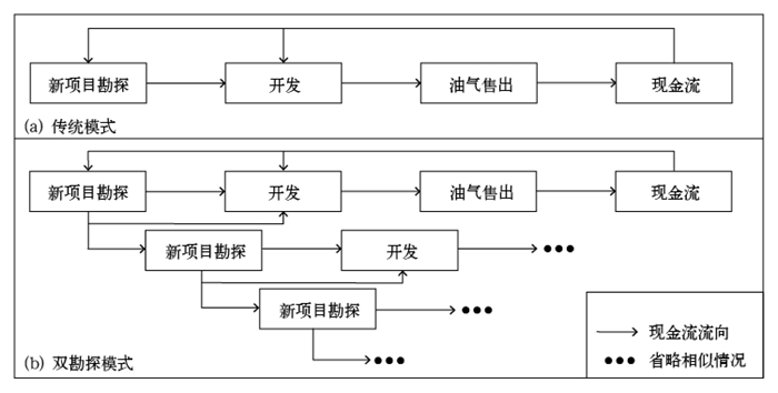 图 1 “双勘探模式”与传统模式现金流流向差异图 Fig. 1 Difference in cash flow directions between the"Dual Exploration Model"and traditional model |