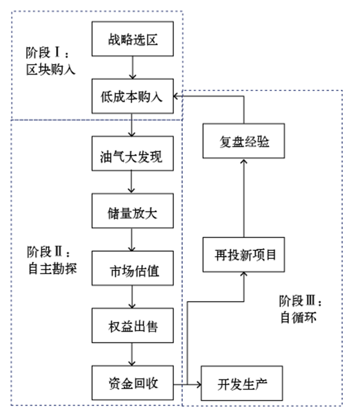 埃尼2025—2028年资本更新计划显示[23],用于“双勘探模式”与“卫星模式”(Satellite Model)战略的现金流一般独立于集团资产负债表之外、以“无母公司担保”方式作为特殊目的载体单独运作管理,主要通过股权出售回收本金与溢价或引入第三方投资实现“自循环”。从现金流角度来看,“双勘探模式”与传统勘探最大的区别就是,在新项目勘探阶段获得大发现后快速通过权益稀释获取现金流,用于该项目的勘探开发或下一个新项目的勘探。而传统勘探模式多通过漫长的先勘探后开发再售出这种线性流程才能获取现金流(图 1)。因此,“双勘探模式”中的“Dual”可以理解为某一新项目的第一轮勘探+获取现金流后再次投入到该项目的下一轮勘探的“双轮”或是某一新项目的第一轮勘探+获取现金流后投入到下一个新项目勘探的“双重”。据此,笔者认为“双勘探模式”是一种以“油气权益区块”和“油气勘探活动”为载体,前提是将“实现了油气勘探大发现”的“权益区块”作为可交易的实物期权,目的是在低油价背景下降低公司投资风险和扩大自身现金流。具体来说,是通过优选全球前沿领域获取高权益区块,利用技术优势获得油气大发现,通过资产价值重新评估在项目勘探阶段快速稀释股权获取现金流,进而投入到该项目的勘探开发或新的项目勘探,在保留作业者身份的同时,主导项目后期生产运营的一种战略框架模式。该模式的核心是把传统的“先勘探、后开发”线性模式转变为“发现—货币化—再发现”闭环模式,使项目在勘探阶段即可获得正现金流,并持续滚动扩大公司油气储量规模。