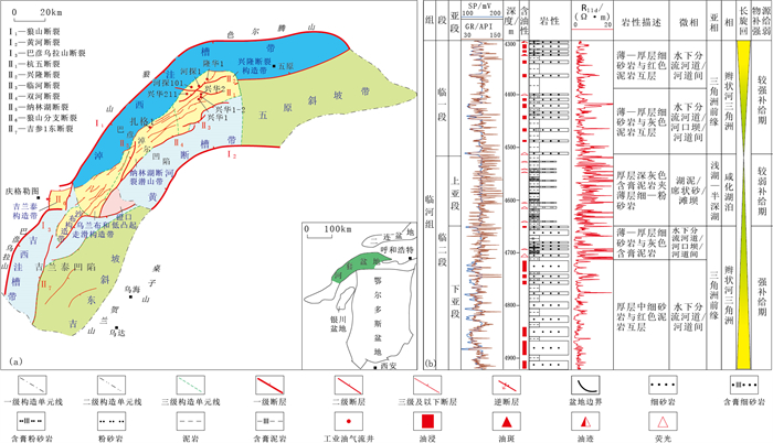 1 区域地质概况河套盆地东部紧邻鄂尔多斯盆地,北部以色尔腾山为界,东南接伊盟隆起、桌子山和贺兰山,西至狼山和巴彦乌拉山,平面上呈北东—东西向弧形展布,为在伊盟古陆核基础上沉陷形成的中生代—新生代坳—断叠合型盆地,总面积约4×104 km2[20-22](图 1)。临河坳陷位于盆地西部,面积约2.24×104km2,以吉兰泰构造带—磴口低凸起为界可分为南部吉兰泰凹陷和北部巴彦淖尔凹陷,总体具西部陡深而东南缓浅的构造特征(图 1)[20]。临河组深层—超深层储层主要分布在巴彦淖尔凹陷,可分为淖西洼槽带、乌兰布和走滑构造带、纳林湖断裂潜山带、兴隆断裂构造带、黄河断槽带和五原斜坡带。临河坳陷基底为太古宇—元古宇的变质岩和花岗岩,坳陷内充填沉积物由老至新为下白垩统李三沟组和固阳组、始新统乌拉特组、渐新统临河组、中新统五原组、上新统乌兰图克组和第四系河套群[20-22]。临河组是主要的油气富集层,在淖西洼槽带最大埋深可达10000m,目前已在兴隆断裂构造带4000~6600m埋深获日产百吨至千吨高产工业油流和亿吨级石油探明储量发现,在纳林湖断裂潜山带和乌兰布和走滑构造带4000~6600m埋深获日产几十吨至几百吨工业油流。临河组由老至新可分为临二段和临一段,临二段自下而上分为临二段下亚段和临二段上亚段(图 1b)。临河组沉积期,水体深度浅且咸化,碎屑物质在缓坡古地貌背景下长距离搬运沉积形成大型辫状河三角洲沉积体系,具有砂泥互层岩性组合特征,主要发育水下分流河道、河口坝和席状砂3类沉积微相砂体[20]。由临二段下亚段至临一段,物源碎屑补给强度由强变弱再变强,地层砂地比由高变低再变高,其中临二段下亚段和临一段为储层主要发育段;临二段上亚段为烃源岩主要发育段(图 1b)。新近系五原组岩性主要为巨厚层红色泥岩,与临河组形成良好烃储盖组合。因此,临河坳陷临河组成藏条件优越。