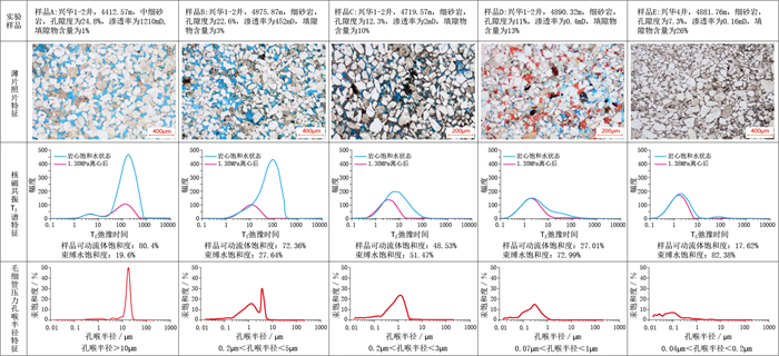 图 10 临河坳陷临河组不同填隙物含量储层薄片照片、核磁共振T2谱和毛细管压力孔喉半径特征图 Fig. 10 Thin section photos, nuclear magnetic resonance T2 spectra, and capillary pressure pore throat radius characteristics of Linhe Formation reservoir with different interstitial material contents in Linhe Depression |