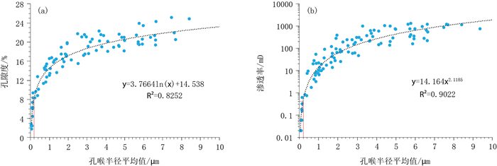 图 11 临河坳陷临河组储层孔喉半径平均值与孔隙度(a)和渗透率(b)交会图 Fig. 11 Cross plot between average pore throat radius and porosity (a) and permeability (b) of Linhe Formation reservoir in Linhe Depression |