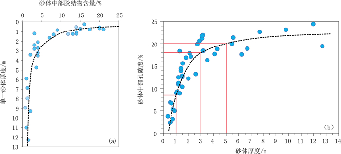 在咸化湖盆地层中,储层中胶结物含量受控于储层在砂体中的位置和砂体厚度,厚层砂体顶部和底部胶结强烈,中部胶结弱,薄层砂体一般整体胶结强烈。临河组储层精细表征表明,随着储层厚度变小,储层胶结物含量增高,物性变差。12口井44个埋深在4500~6500m范围的泥杂基含量小于3%的砂体单层厚度和中部胶结物含量(图 12a)、孔隙度(图 12b)之间具有良好的相关性:厚度小于1m的砂体中部胶结物含量在12%以上,孔隙度在8.5%以下;厚度介于1~3m砂体中部胶结物含量范围为5%~12%,孔隙度范围为8.5%~18%;厚度介于3~5m砂体中部胶结物含量范围为3%~5%,孔隙度范围为18%~20%;厚度大于5m砂体中部胶结物含量小于3%,孔隙度大于20%。因此,临河组有效储层孔隙度下限为8.5%,对应的砂体厚度下限为1m。试油数据显示,厚度小于1m砂体试油结果一般为干层,日产百吨油以上产能砂体厚度一般大于3m,日产200吨油以上产能砂体厚度一般大于5m,总体表现为储层厚度越厚,日产油量越高(图 13)。