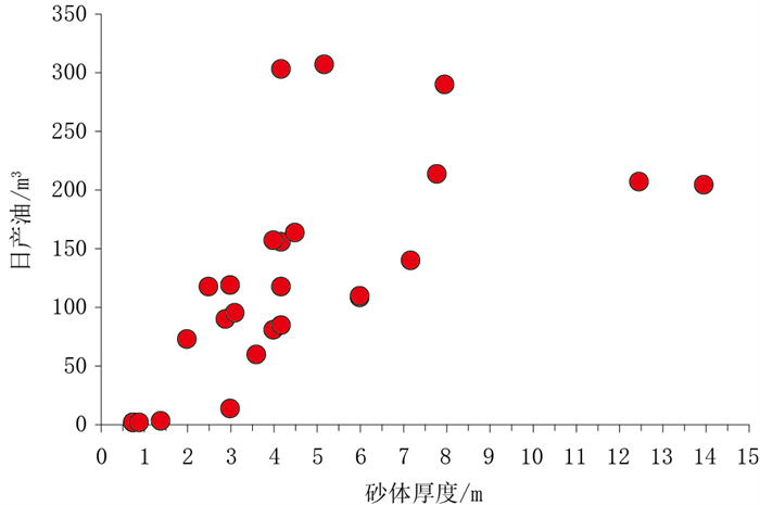 图 13 临河坳陷临河组储层砂体厚度与试油日产油量关系图 Fig. 13 Relationship between thickness of Linhe Formation sandstone reservoir and daily oil rate during well testing in Linhe Depression |
