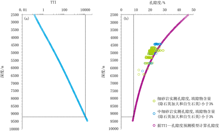 临河坳陷临河组储层随着埋深和温度增加,孔隙度逐渐减小。在建立临河组优质储层TTI与孔隙度关系模型(图 9)和TTI与深度(图 14a)关系基础上,可建立优质储层孔隙度随深度预测模型(图 14b):ϕ=e(17691-Z)/3978(其中ϕ为孔隙度,%,Z为深度,m)。有效储层埋深下限的预测方法是根据临河组有效孔隙度下限值8.5%,通过优质储层孔隙度随深度预测模型求取深度值为9177.8m。因此,预测临河坳陷临河组厚度大于1m、胶结物含量(除石英加大和自生石英)低于3%且不含泥杂基的优势沉积微相砂体形成常规有效储层的勘探埋深下限约为9200m。