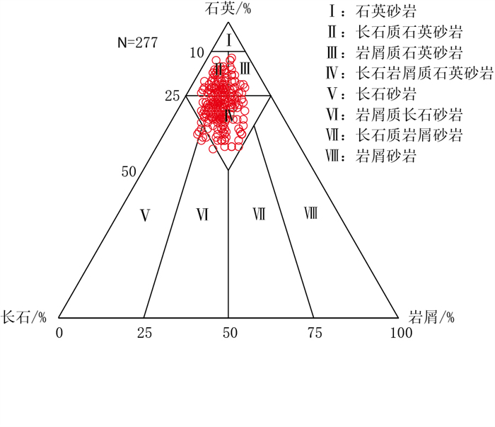 图 2 临河坳陷临河组砂岩岩矿三角图(N为样品数) Fig. 2 Mineral composition triangle of Linhe Formation sandstone in Linhe Depression (N is the number of samples) |