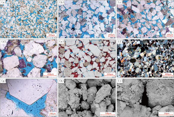 图 3 临河坳陷临河组砂岩储层储集空间及成岩作用特征图 Fig. 3 Reservoir space and diagenetic characteristics of Linhe Formation sandstone in Linhe Depression (a)兴华1-2井,4845.7m,临二段,中细粒长石岩屑质石英砂岩,原生粒间孔为主,颗粒间呈点—线接触,压实作用弱,铸体薄片,单偏光;(b)兴华211井,6245.89m,临二段,中细粒长石质石英砂岩,原生粒间孔为主,颗粒间呈点—线接触,压实作用弱,铸体薄片,单偏光;(c)河探1井,6195m,临一段,中细粒长石岩屑质石英砂岩,原生粒间孔为主,颗粒间呈点—线接触,压实作用弱,局部发育方解石胶结物,铸体薄片,单偏光;(d)河探1井,6237m,临一段,中细粒岩屑石英砂岩,方解石呈自形晶充填局部粒间孔隙,压实作用弱,铸体薄片,单偏光;(e)兴华2井,4476.12m,临一段,中细粒长石岩屑质石英砂岩,方解石呈连晶状充填粒间孔隙,压实作用弱,铸体薄片,单偏光;(f)兴华1-2井,4909.04m,临二段,中细粒长石质石英砂岩,硬石膏呈连晶状充填粒间孔隙,铸体薄片,正交偏光;(g)河探1井,6195m,临一段,中细粒长石岩屑质石英砂岩,石英碎屑颗粒发育石英加大边;(h)兴华1井,4239.5m,临河组,细砂岩,原生粒间孔大,粒间喉道较粗,扫描电镜照片;(i)兴华2井,4474.75m,临一段,细砂岩,原生粒间孔大,粒间喉道较粗,扫描电镜照片 |