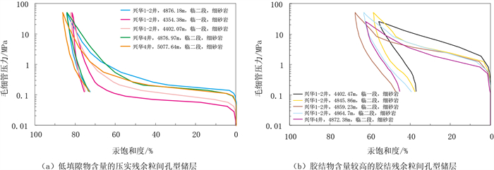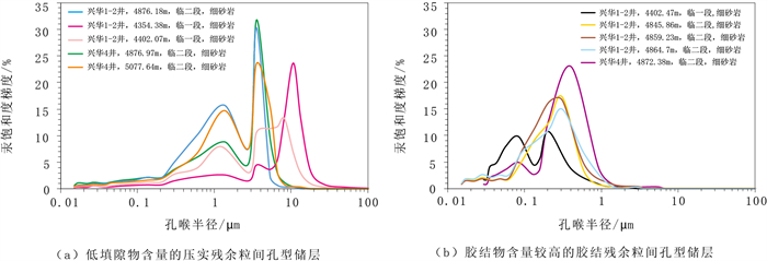 兴华1-2井等井高压压汞测试数据统计表明,临河组低填隙物含量的压实残余粒间孔型储层排驱压力集中于0.03~0.14MPa,平均为0.08MPa,喉道半径主体集中于1.94~16.46μm,平均为5.16μm,为大孔粗喉型储层;毛细管压汞曲线主要呈偏粗歪度形态,具明显大幅度平台,表明喉道直径较粗且分布均匀(图 4a,图 5a)。胶结物含量较高的胶结残余粒间孔型储层排驱压力集中于0.24~3.42MPa,平均为1.58MPa,喉道半径范围为0.08~1.14μm,平均为0.3μm,为细喉道—微细喉道型储层,胶结物含量越高,排驱压力越大,孔喉半径越小;毛细管压汞曲线主要呈偏细歪度形态,并具一个小幅度平台,表明喉道直径较细且分布不均(图 4b,图 5b)。