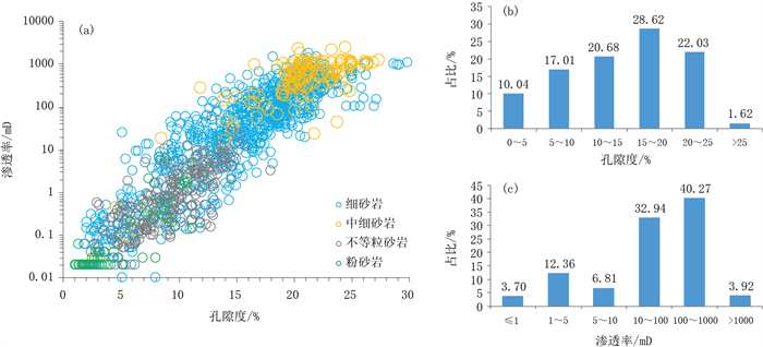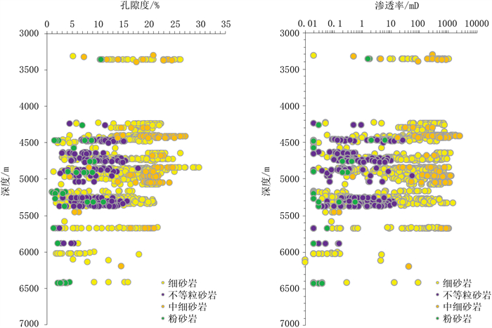 39口井1853块储层岩心常温常压气测孔渗分析数据统计结果表明,临河组深层—超深层储层整体属于中孔—高孔、中渗—高渗储层。储层孔隙度和渗透率呈较好的线性相关关系,表明原生粒间孔隙为主要的渗流通道(图 6a)。储层孔隙度介于1%~30%,主体集中于10%~25%,平均约为17%(图 6b);渗透率介于0.01~2550mD,主体集中于10~1000mD,平均约为176mD(图 6c)。其中埋深为4500~6000m的深层发育高孔—高渗储层,孔隙度达25%~30%,渗透率达500~2550mD;埋深大于6000m的超深层发育中孔—中渗储层,孔隙度达15%~18.3%,渗透率达42.9~88mD(图 7)。相同埋藏深度条件下,储层受碎屑颗粒分选、粒度、泥质含量和胶结物含量控制,中细粒砂岩分选较好、填隙物含量较低,表现为中孔—高孔、中渗—高渗特征,不等粒砂岩和细砂岩填隙物含量较高,表现为低孔—超低孔、低渗—超低渗特征(图 7)。