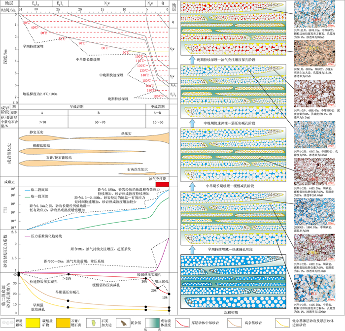 (3)临河组低填隙物含量的优质原生孔隙型砂岩储层经历了早期持续深埋沉积期由于静岩压实效应导致的快速减孔、中期长期浅埋—缓埋沉积期由于低地温造成的弱热压实缓慢减孔、中晚期快速深埋沉积期由于经历较短高温时间导致的弱热压实减孔和晚期持续深埋沉积期由于油气持续充注引起的超高压增压保孔4个阶段。