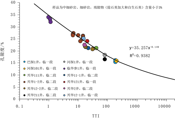 4.1 储层孔隙度预测对于一定成分成熟度和结构成熟度的砂岩,决定孔隙保存程度的主要因素为地温、地质年代和埋藏方式,砂岩埋藏过程中成岩作用及孔隙度的变化是砂岩埋藏过程中经历的时间和温度的综合响应,即可用时温指数(TTI)来反映,而不是单纯的埋藏深度的概念[25-26]。根据前人关于孔隙度随深度变化的研究表明,孔隙度与深度呈指数关系,即ϕ=aebZ(其中ϕ为孔隙度,%;a和b为常数;Z为深度,m),公式中eZ一定程度上反映了TTI。因此,可推测砂岩埋藏过程中孔隙度损失变化与砂岩经历温度和时间综合响应呈幂函数关系,即:ϕ=A(TTI)B(其中A和B为常数)。因此,可建立TTI与孔隙度的函数关系来预测未知深度砂岩的孔隙度,实现钻前孔隙度预测。临河组低填隙物深层—超深层优质储层砂岩孔隙成岩演化主要受控于热压实动力场,即地温场和埋藏轨迹,可用TTI来表征储层热压实效应强度。对临河坳陷临河组已有钻井及岩心取样分析,恢复地层埋藏史和热演化史获取样品所在埋深的TTI值,实验测试分析获取样品的填隙物含量、粒度和物性。选取填隙物含量小于3%的中细砂岩和细砂岩样品,分析其孔隙度与TTI值关系,砂岩孔隙度与砂岩的TTI值存在良好的幂函数关系,建立了临河组低填隙物含量砂岩的孔隙度预测模型:ϕ=35.257(TTI)-0.149(图 9)。