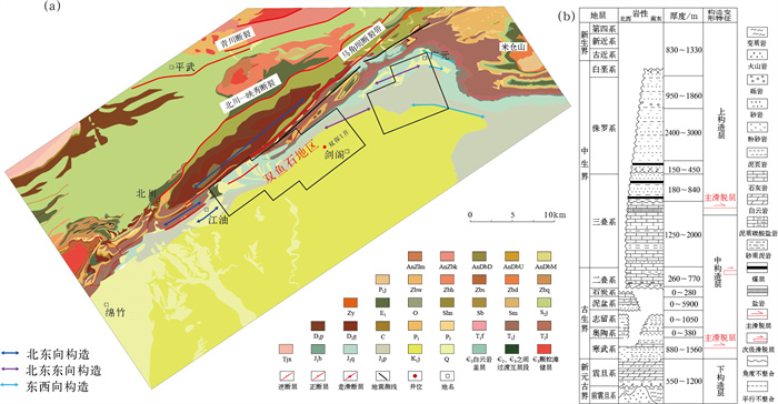 1 地质概况双鱼石地区纵向沉积演化呈现两大差异性阶段,形成了该区二叠系构造变形的顶底板主要滑脱层及浅层碎屑岩盖层:第一阶段为震旦纪—晚二叠世拉张背景下的被动大陆边缘演化阶段,形成巨厚海相碎屑岩—碳酸盐岩地层序列,其中下寒武统筇竹寺组在川西北裂陷槽内发育巨厚深水成因黑色泥岩,厚度达150~550m,为区域构造活动的关键深部滑脱层; 早—中三叠世受碳酸盐台地沉积相主控,沉积较厚泥岩—膏盐层系,厚度为300~650m, 构成区域关键浅部滑脱层; 此外,志留系受加里东运动剥蚀作用,残余厚度有限,仅在局部地区以黑色碳质板岩、千枚岩及泥页岩为主,形成区域次要滑脱层。第二阶段为晚三叠世至现今挤压背景下的冲断隆升与陆内俯冲型前陆盆地演化阶段,相应形成上三叠统—第四系陆相碎屑岩序列 [3, 19-20]。基于地层特征分析,双鱼石地区明确发育寒武系、三叠系两套主滑脱层,作为碳酸盐岩主体变形区的顶底板滑脱层,控制了变形强度与褶皱特征(图 1)。