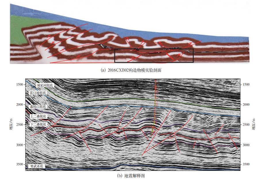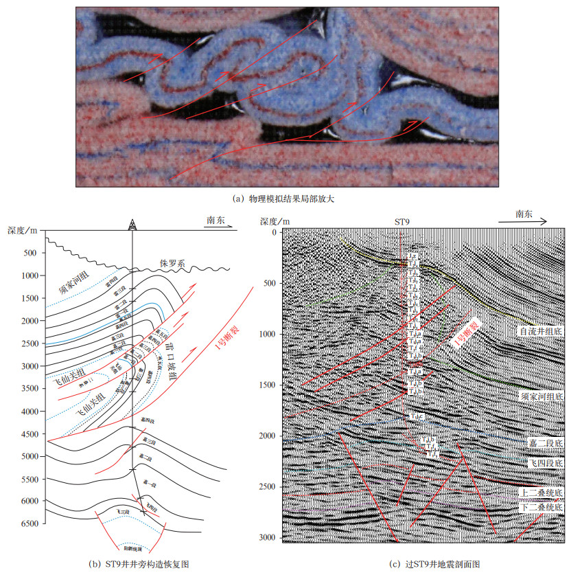 图 10 四川盆地ST9井井旁构造及倒转构造模拟实验图像 Fig. 10 ST9 well side structure and simulation experiment image of reversal structure in Sichuan Basin |