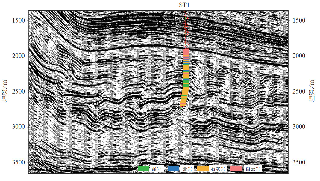 图 2 四川盆地双鱼石构造inline2520线叠前时间偏移剖面与岩性剖面归位图 Fig. 2 Pre-stack time migration profile of seismic inline2520 and lithological section in Shuangyushi structure, Sichuan Basin |