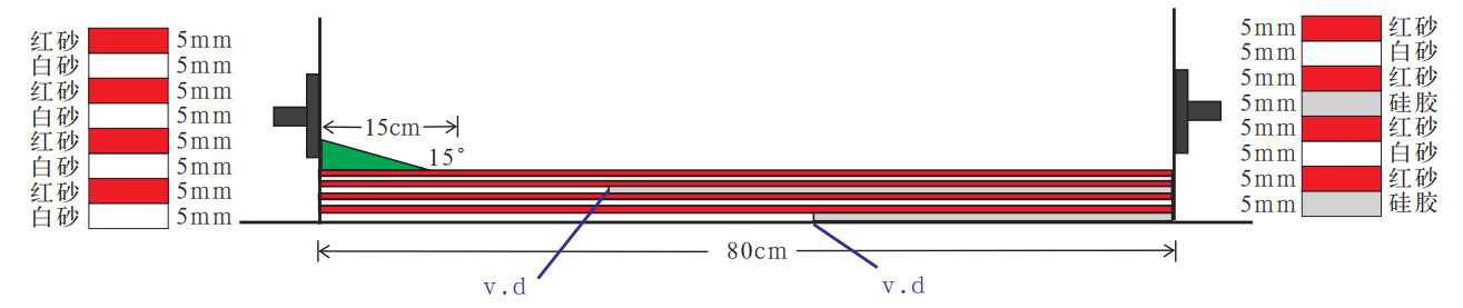 2.1 构造物理模拟模型设计本次物理模拟实验基于相似性原则,该原则是最基本且最重要的原则之一。本次物理模型基于地层结构,设计了两个区域性滑脱层,又根据两套滑脱层厚度差异对构造变形的影响,进一步设计了“底部滑脱”和“上下双滑脱”两种模型。模型其他关键要素设定如下。(1)动力机制:模型采用单侧挤压的方式,模拟青藏高原向东扩展而对川西北的挤压冲断机制。(2)地层设置:研究区在寒武系和三叠系嘉陵江组发育大量膏盐层,作为力学性质较弱的非能干层,膏盐层具有不同于脆性层的力学性质,考虑到山前膏盐层剥蚀殆尽,因此塑性层只在往盆地方向铺设,构建滑脱体系。(3)地貌条件:由于模拟结果主要关注新生代晚期变形,作为燕山末期就存在的冲断带,山前往往地形较高,因此在推板一侧设置楔形体来模拟继承性古地形,相关参数见图 3。(4)相似比例:本次实验采用长80cm、宽35cm、厚4cm的石英砂和硅胶来模拟地层,其中硅胶代表滑脱层,石英砂代表刚性地层,采用0.001mm/s的推进速率,相关参数见表 2。(5)速度不连续点(v.d点):因为构造优先于v.d点发育,因此,根据残余地层的分布情况分别设置了基底和盖层中部两个v.d点。
