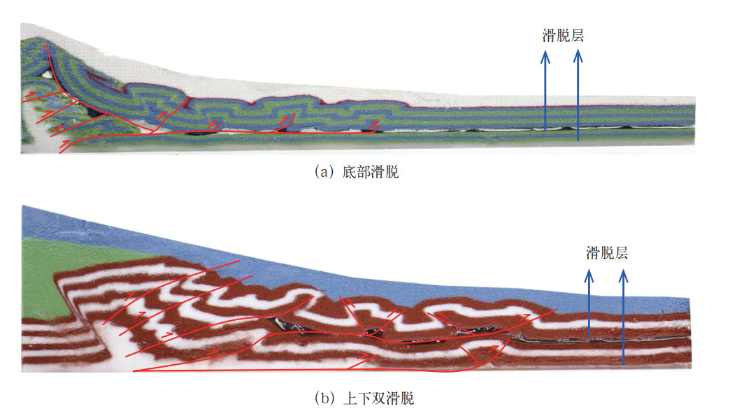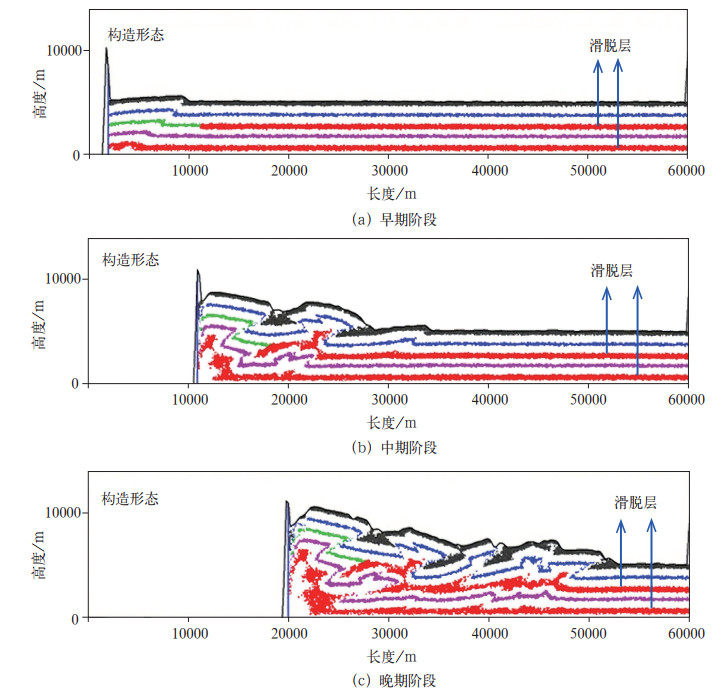 双层滑脱介质数值模拟演化表明,研究区发育深浅两套不同构造样式:浅层为低角度断层组合的叠瓦状构造,深层为低幅度潜伏构造,总体呈现前展式发育特征; 在深部与中部滑脱层共同作用下,由一组低角度叠瓦逆冲岩片组成,形成“浅部高陡构造—深部低幅度构造”的垂向分异特征(图 9)。