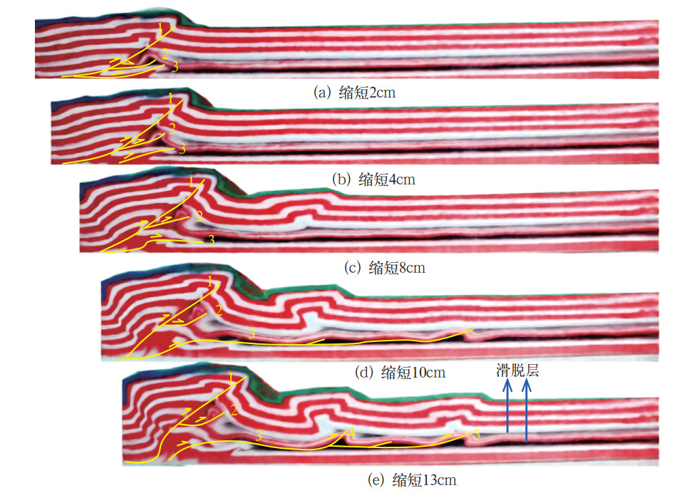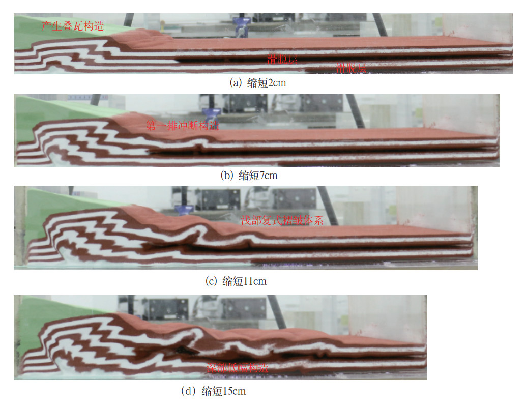 图 5 上下双滑脱模型构造变形过程图像 Fig. 5 Images of structural deformation process of the "upper-lower double detachment model" |